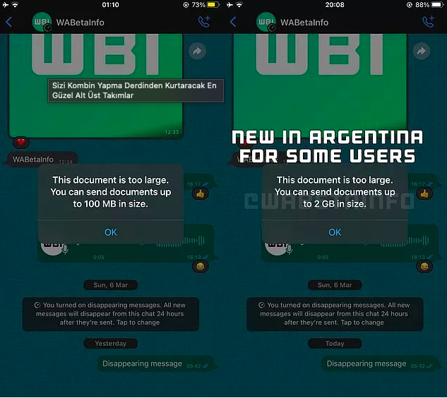 WhatsApp'te yakında dosya paylaşım sınırı 2 GB olabilir. Özellik şu anda Arjantin'de test aşamasında.